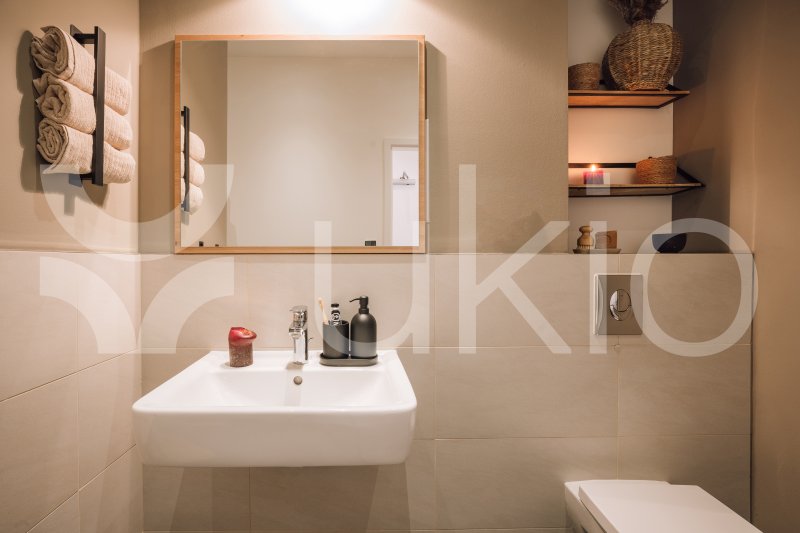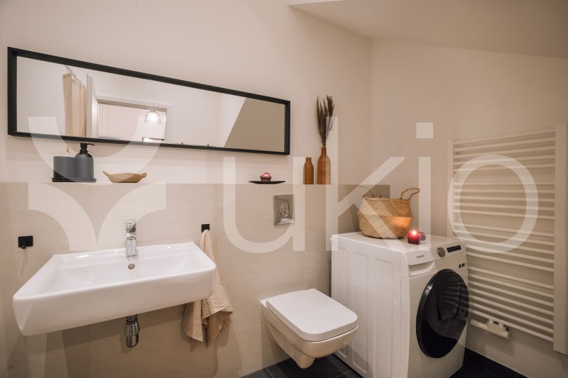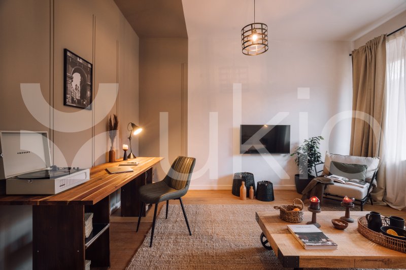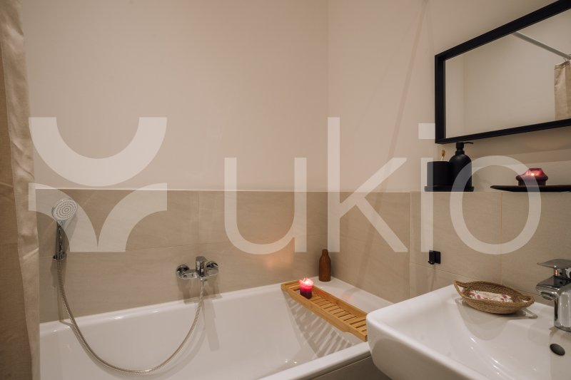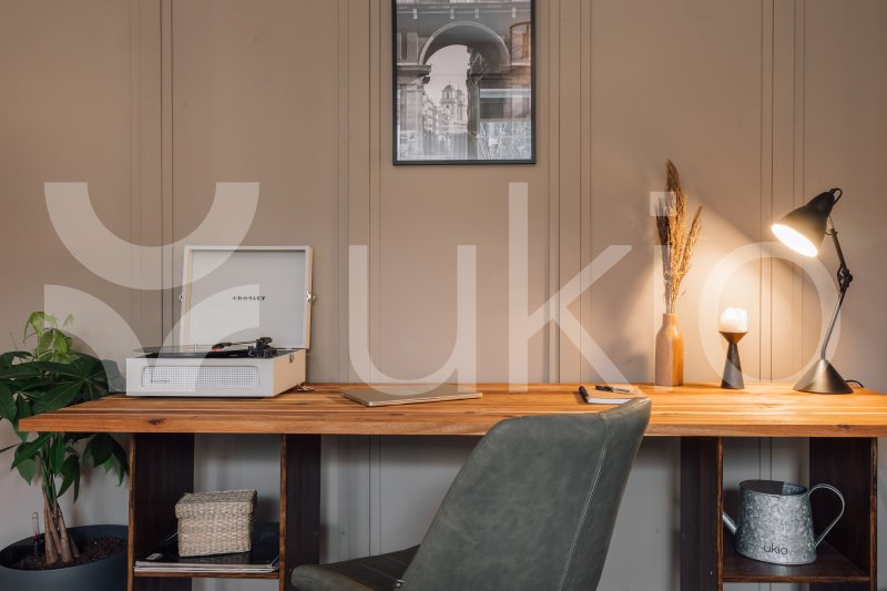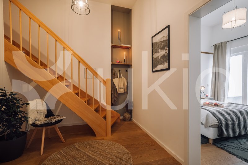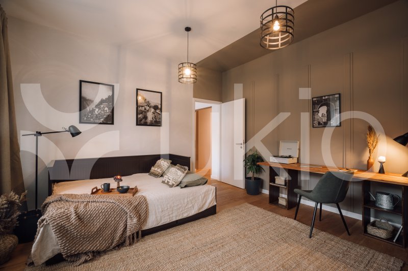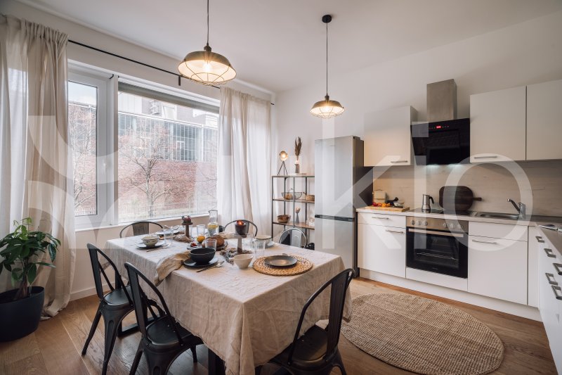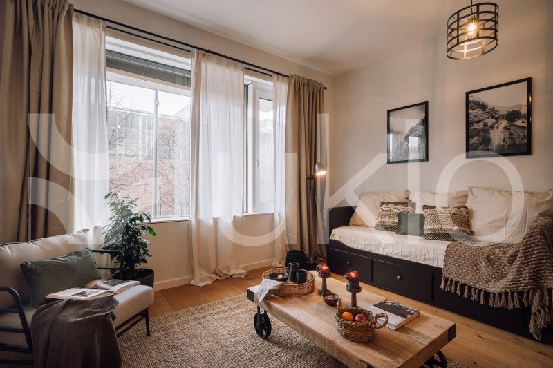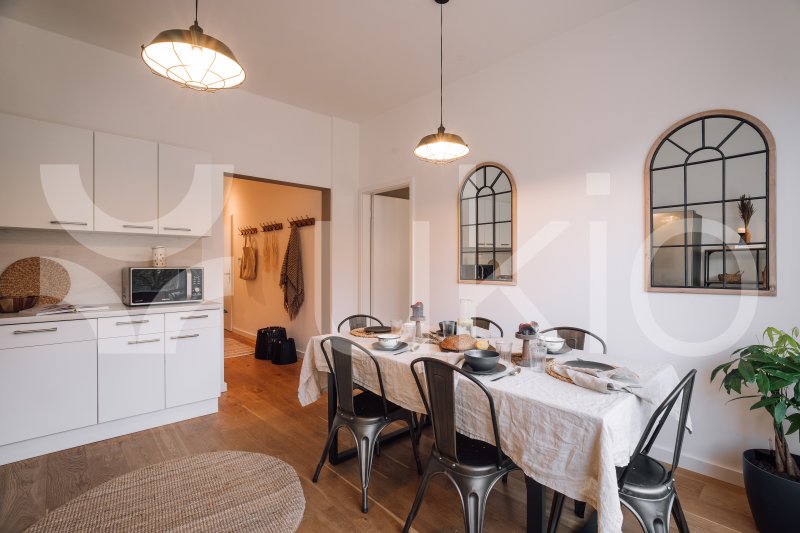 The spacious living room has a dedicated workstation, and the fully equipped kitchen comes with all essentials for home-cooked meals. A rustic dining table adds charm, and the terrace offers a peaceful outdoor retreat. With bike storage available, guests can easily explore the city. Fully furnished, the apartment provides everything you need, including bedding and linens.