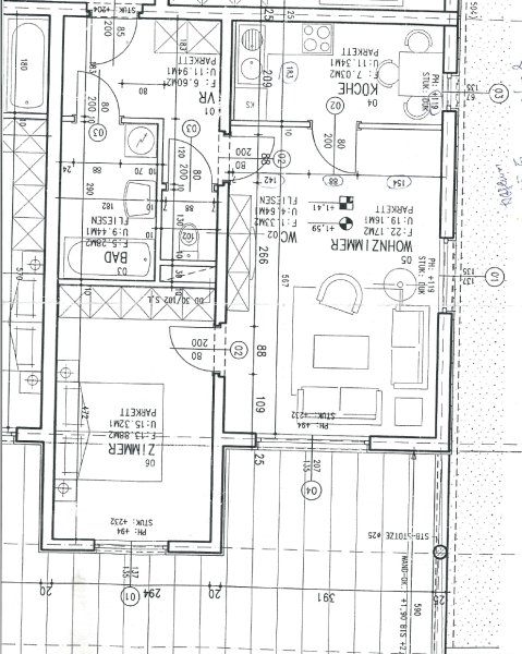 2 Zimmer: (Schlafzimmer und Wohnzimmer), extra Küche, Bad, WC, Vorraum. Gute Raumaufteilung.