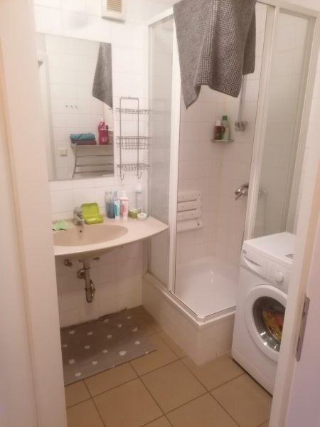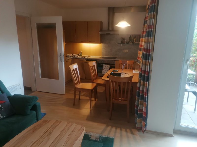Vollmöblierte Kleinwohnung mit Einbauküche und Geschirrspüler, ausziehbares Sofa, Doppelbett, Waschmaschine, Kleiderschrank, Garderobe, Esstisch mit Stühlen.