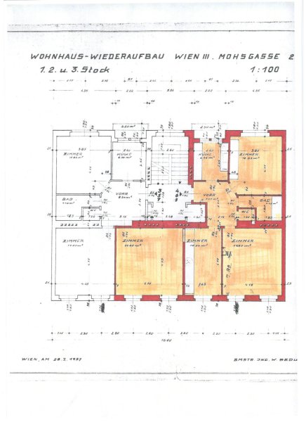 Zwei große Zimmer (2 x c. 20 Quadratmeter, sowie ein Kabinett sind aus dem Vorraum begehbar. Aus dem Kabinett betritt man das größte Zimmer. Auch zentral begehbar sind Küche, Bad und Toilette. Auf den Balkon gelangt man durch die Küche. Die Wohnung ist hell und, trotz zentraler Lage sehr ruhig. Sie ist, durch die Wärmeisolierung leicht heizbar und im Sommer angenehm kühl.