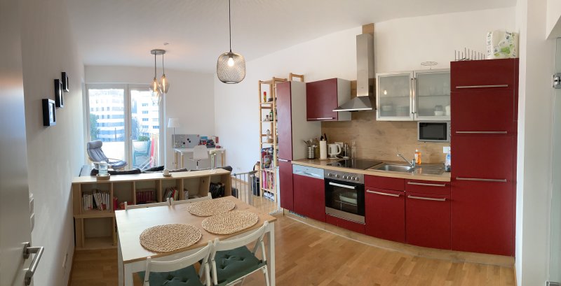 Wie ihr auf den Fotos sehen könnt, ist die Wohnung sehr neu. Die rote Küche und die Glastür machen die Wohnung sehr heimelig und modern. Sie hat ein großes Kellerabteil und auch einen Tiefgaragenplatz, der im Preis inkludiert ist. Natürlich gibt es auch Stellplätze fürs Fahrrad!