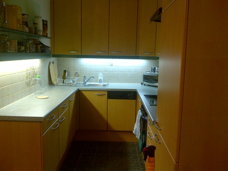 Küche (~6m²) mit Einbaumöbeln inkl. Kochplatte, Backrohr, Geschirrspüler, Kühlschrank, Boden und Wandteile verfliest