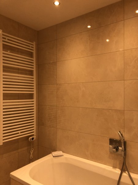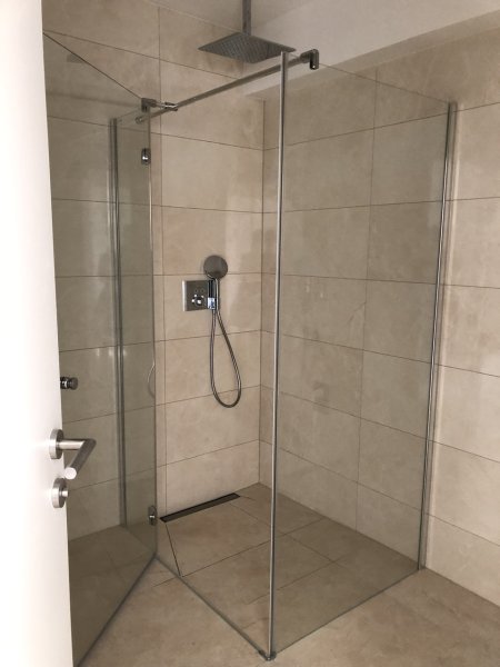 Badezimmer mit Badewanne und Duschkabine mit Regendusche.Waschmaschinenanschluss