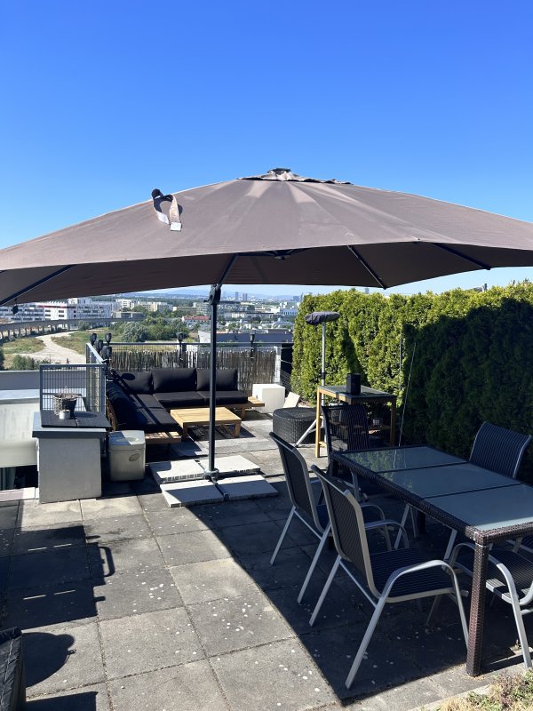 Die Wohnung ist 82 m2 groß inkl. geschlossener Loggia (Wintergarten). Das Highlight ein eigener Dachgarten mit 107,56 m2 inkl. Terrasse.