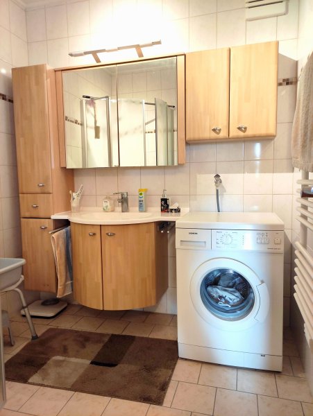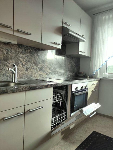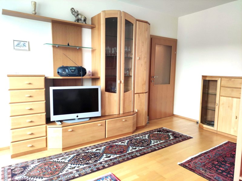 Die Wohnung wird komplett möbliert (helle Holzmöbel), komplettes Bad mit Duschkabine, komplette Einbauküche mit Geräten, mit allem Inventar (Geschirr, TV, Waschmaschine, Kühlschrank, Geschirrspüler, etc.) vermietet.
