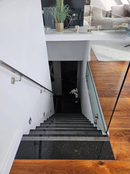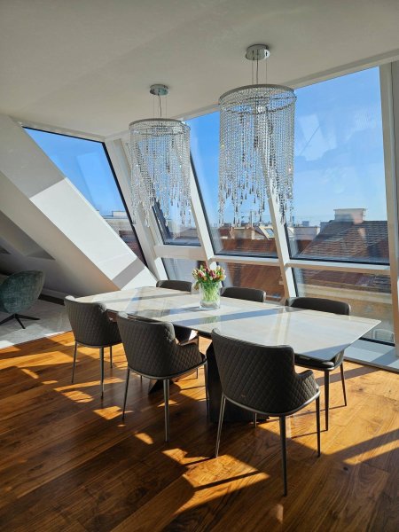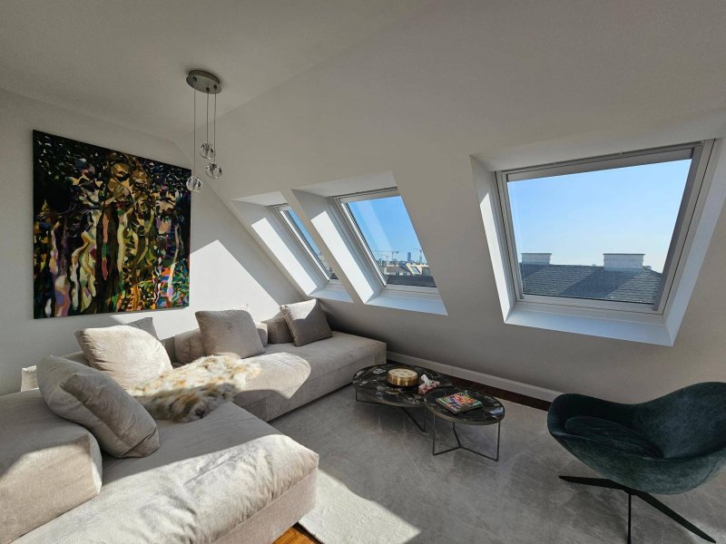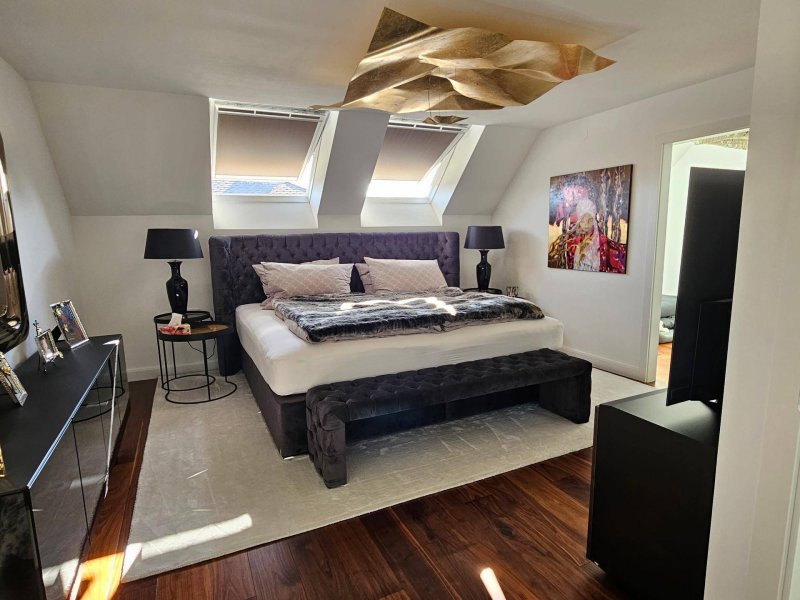Zum Vermitung gelangt eine wunderschöne, gut geschnittene Dachgeschosswohnung auf 2 Etagen. In der unteren Etage befinden sich der Eingangsbereich, ein Abstellraum mit Waschmaschine und Trockner sowie einer neuen Vaillant-Therme, das 17m2 grosse Gäste- oder Kinderzimmer und das Gästebadezimmer mit Dusche und WC. Über den 23 m2 grossen Masterbedroom gelangt man in das 12 m2 Ankleidezimmer, das auch als Büro genutzt werden könnte und weiter in das 16 m2 grosse luxuriöse Badezimmer en-suite. In der oberen Etage befindet sich der wunderschöne lichtdurchflutete Wohn-Essbereich, ein Gäste-WC sowie der Ausgang zu der 30 m2 grossen Terrasse, die im Frühjahr mit neuen hochwertigen Keramikfliesen neu gestaltet wurde. Die Küche verfügt über eine Backrohr-Mikrowellen-Kombination, einen Kompaktbackofen mit Dampfgarer-Funktion, eine Wärmeschublade, einen Geschirrspüler, einen Induktionsherd (Bora Professional) und eine Side-by-Side Kombination bestehend aus Kühlschrank, Weinschrank und Gefrierschrank mit eigenem Wasseranschluss für das Eiswürfelfach von der Firma Liebherr. Über die Velux-Dachfenster gelangt viel Licht in beide Etagen, selbstverständlich werden diese elektrisch gesteuert mittels Touchpad und verfügen über einen Sonnenschutz aussen und Verdunklungsrollos innen.