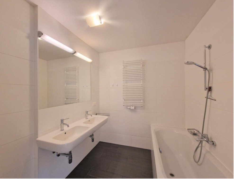 • Badezimmer mit Doppelwaschbecken und Badewanne