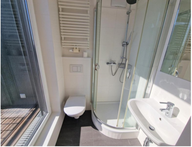 • Badezimmer mit Dusche, Waschbecken und WC