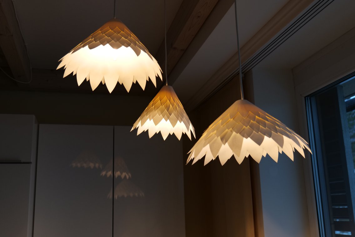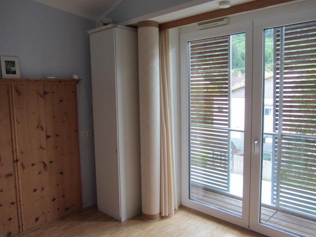 Das Wohnzimmer liegt im ersten Stock und ist etwa 50 m2 groß. Große Fensterfront nach Süden ausgerichtet. Geräumige integrierte Küche. Die zwei Schlafzimmer haben große Raumhöhe und liegen im zweiten Stock. Deren Fenster sind ebenso nach Süden gerichtet. Vor allen Fenstern verschiebbare Schattenelemente aus Holz.