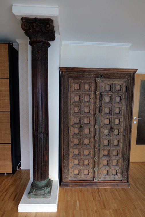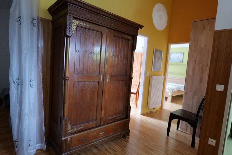Hochwertige Vollholzmöbel sind ausreichend vorhanden. Waschmaschine im Badezimmer.