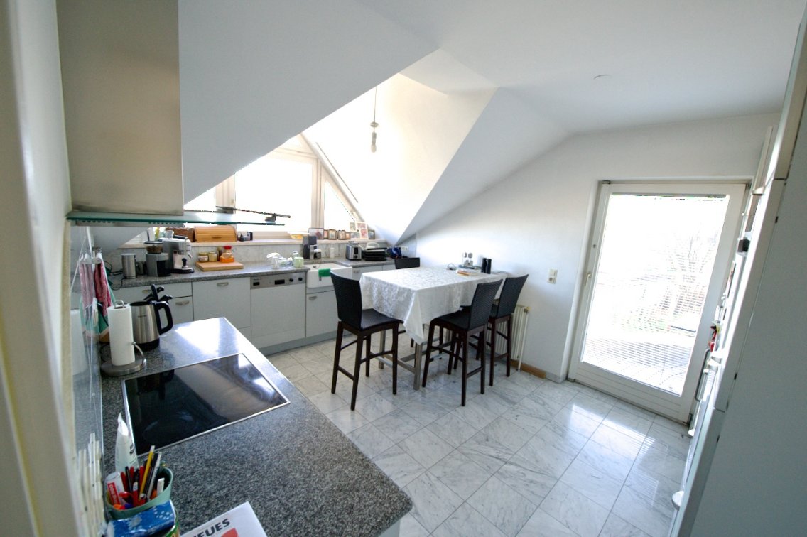 Die geräumige Küche mit eingebauten Kästen & Geräten bietet ebenfalls einen traumhaften Blick in die grüne Ferne. Von hier aus gelangen Sie direkt auf Ihren romantischen Balkon, auf dem Sie in der Sonne, mit Blick, Ruhe und Grün genießen können.
