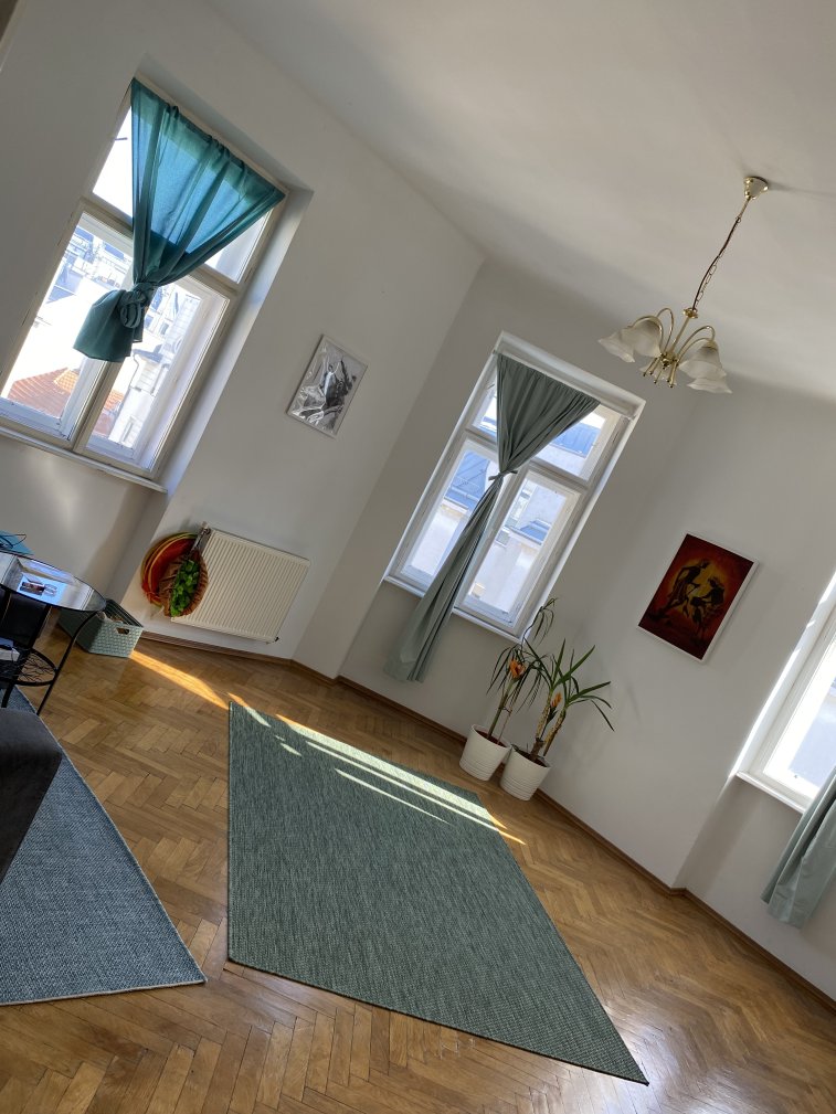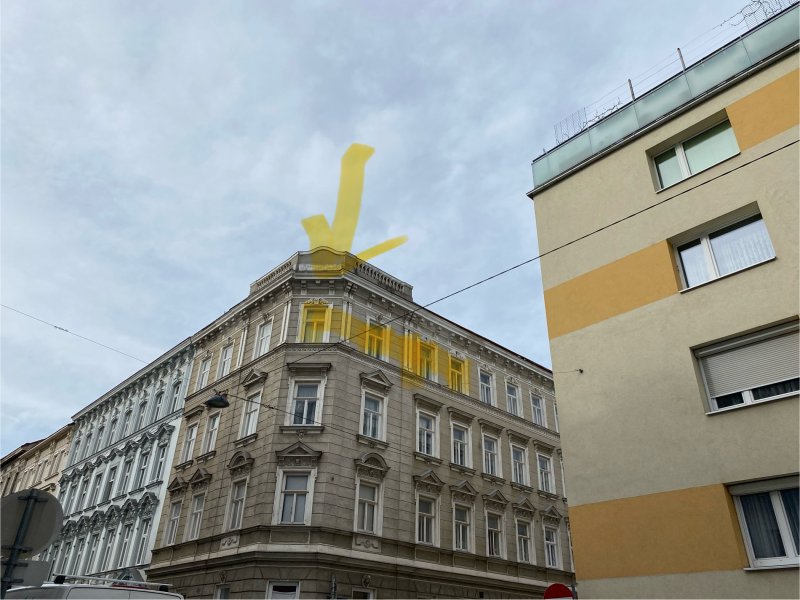 Wohnung liegt im 3. Stock (OHNE Lift), darüber befindet sich der Dachboden, Wohnung hat keine Dachschrägenfenster, Altbau-Charme mit doppelten Flügelfenstern, alter Fischgrätboden, Wohnzimmer am Eck mit Fenstern an zwei Seiten, daher sehr hell.