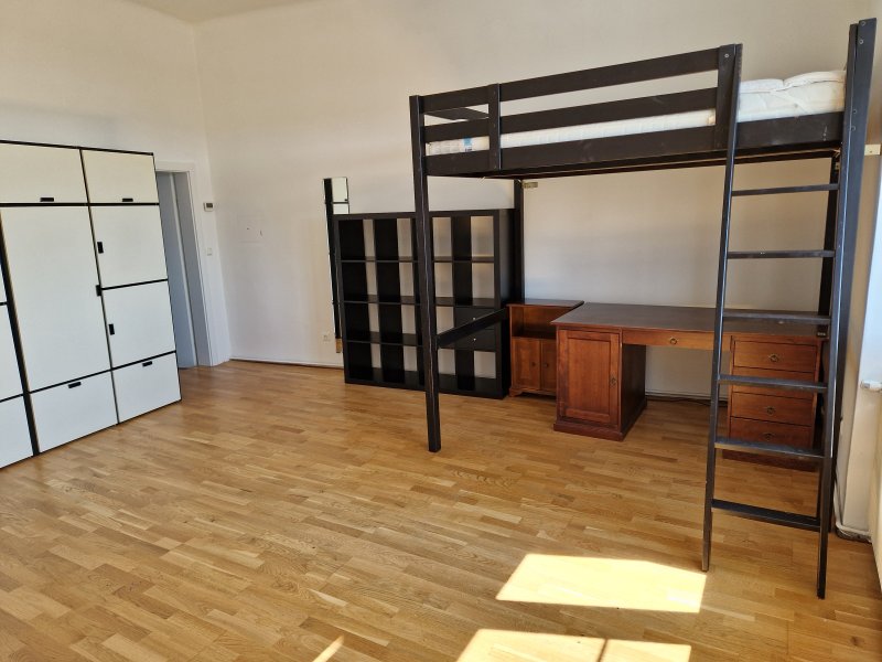 Es wird ein 25m² Raum vermietet. Der Raum ist teilmöbliert und wurde frisch ausgemalt. Das Zimmer hat ein großes Fenster mit Außenjalousie (elektrisch) sowie einen Insektenschutzgitter. Der Raum ist sehr hell und man hat eine weitläufige Aussicht (kein Haus direkt gegenüber). Die Beleuchtung erfolgt über einen Luster mit dimmbaren LED Lampen, sowie einer Wandleuchte und einer Beleuchtung unter dem Stockbett für den Schreibtisch. Es befindet sich in dem Raum folgende Möbel: