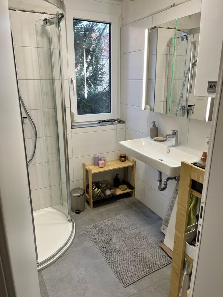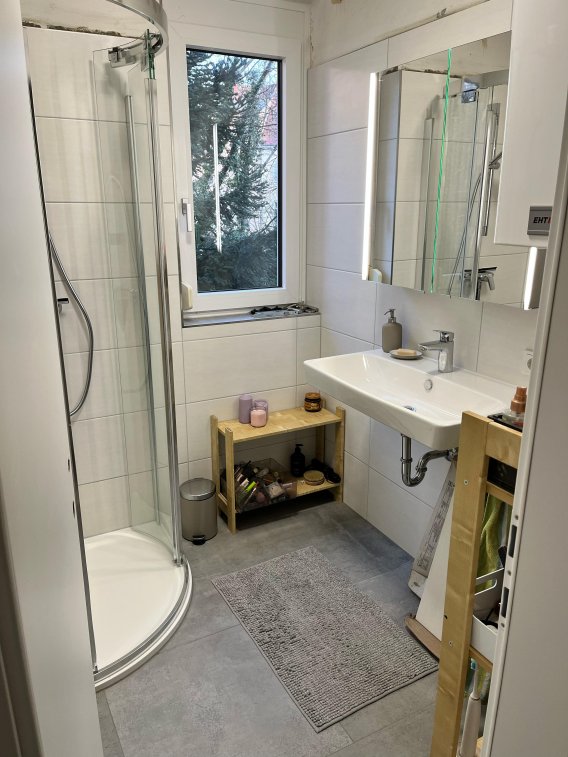 Das Bad ist noch nicht ganz fertig renoviertwird aber spätestens Ende März fertig sein. Im Keller steht eine gemeinschaftliche Waschmaschine zur Verfügung.