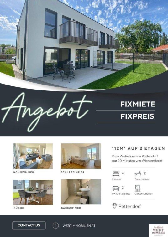abzüglich Kaufbonus 27.287,-,- EuroKaufbetrag nach 5 Jahren: 436.827,- Euro• Flexibles Optionsrecht: Ihr Optionsrecht auf den Kauf der Immobilie ist übertragbar – ideal für individuelle Lebensplanungen oder WeitergabenDiese Vorteile machen das Mietkaufobjekt Pottendorf zu einer sicheren und flexiblen Möglichkeit, den Traum vom Eigenheim zu verwirklichen.KONTAKT : Ljiljana Lukijanovic/ [Telefonnummer entfernt] [E-Mail-Adresse entfernt]Jetzt Ihre Chance nutzen!Sie profitieren jetzt im Rahmen der „Wohnbau-Offensive“ von der Gebührenbefreiung!