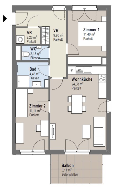 Fußböden: gefliest grau (Nassräume) bzw. Echtholz-Parkett Eiche Weizer