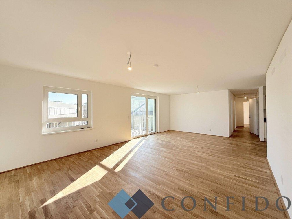 Diese exklusive und klimatisierte 5-Zimmer-Wohnung mit rund 121 m² Wohnfläche, knapp 11m² Balkon und rund 7m² Terrasse steht ab sofort zur befristeten Vermietung. Der moderne Grundriss und die hochwertige Ausstattung sorgen für ein besonderes Wohngefühl. Der einladende Vorraum führt direkt in das rund 45 m² große Wohnzimmer mit offener, voll ausgestatteter Küche (MIELE Geräte). Der angrenzende Abstellraum bietet zusätzlichen Stauraum. Über den zentralen Wohnungsflur sind alle Räume separat zugänglich. Die Wohnung verfügt über 4 Schlafzimmer, wobei das größte mit einem eigenen Badezimmer mit Dusche und Toilette sowie einer windgeschützten Terrasse mit 6,6 m² punktet. Ein weiteres geschmackvoll verfliestes Badezimmer ist mit einer Badewanne, einer Toilette und einem Waschtisch ausgestattet. Zusätzlich gibt es zwei separate WCs. Der nach Süden ausgerichtete Balkon mit 11,2 m² ist direkt vom Wohnzimmer aus begehbar und lädt zum Entspannen ein. Ein Kellerabteil sorgt für zusätzlichen Stauraum.Besonders hervorzuheben ist die nachhaltige Bauweise des Gebäudes. Eine Photovoltaikanlage speist den Allgemeinstrom des Hauses, wodurch die Betriebskosten reduziert und gleichzeitig ein wichtiger Beitrag zum energieschonenden Wohnen geleistet wird.In der hauseigenen Tiefgarage sind noch Garagenplätze zur Anmietung verfügbar. Die Größen sowie die monatlichen Mieten variieren zwischen einer Gesamtmiete inkl. USt. von € 96 - € 144.