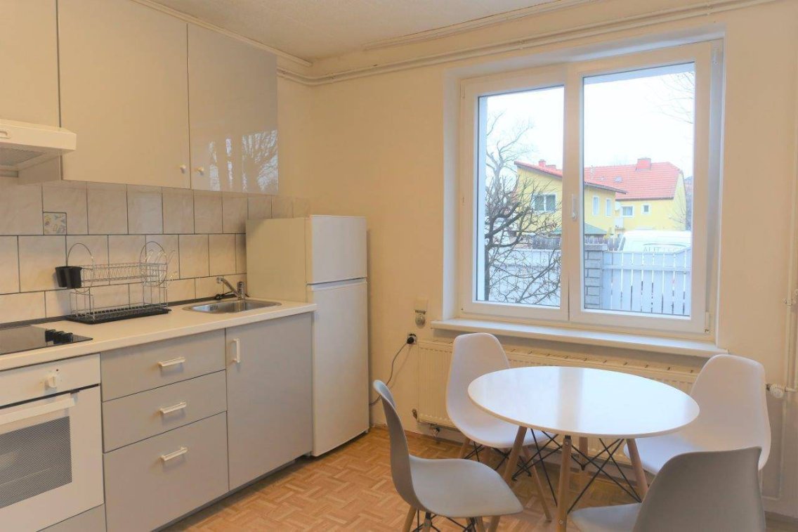 Küche mit allen E-Geräten und WM- Anschluss, Wohnzimmer, Kabinett, kleines Badezimmer mit Handwaschbecken und Dusche, separate Toilette.