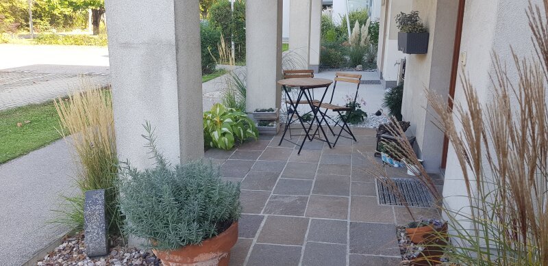 Im Erdgeschoß befindet sich neben Vorraum und WC ein geräumiges Wohnzimmer mit offener Wohnküche. Von Frühling bis Herbst erweitern Sie diesen Bereich um die regengeschützte Sitzterrasse. Optisch gut abgetrennt durch den ansprechenden Stiegenbereich finden Sie weiters Ihr Home-Office Büroplatz mit direktem Blick ins Grüne.
