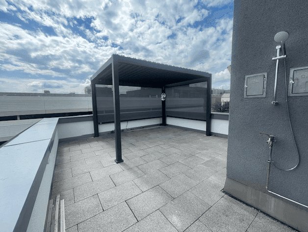 Die Wohnung verfügt über 3 Schlafzimmer, ein Badezimmer mit Badewanne und eine Einbauküche. Zu den weiteren Ausstattungsmerkmalen zählen Parkettböden, Klimaanlage und Fernwärmeheizung. Der Zustand der Wohnung ist neuwertig. Die großzügige Terrasse bietet zusätzlichen Wohnraum im Freien und ergänzt das moderne Loft-Ambiente perfekt.