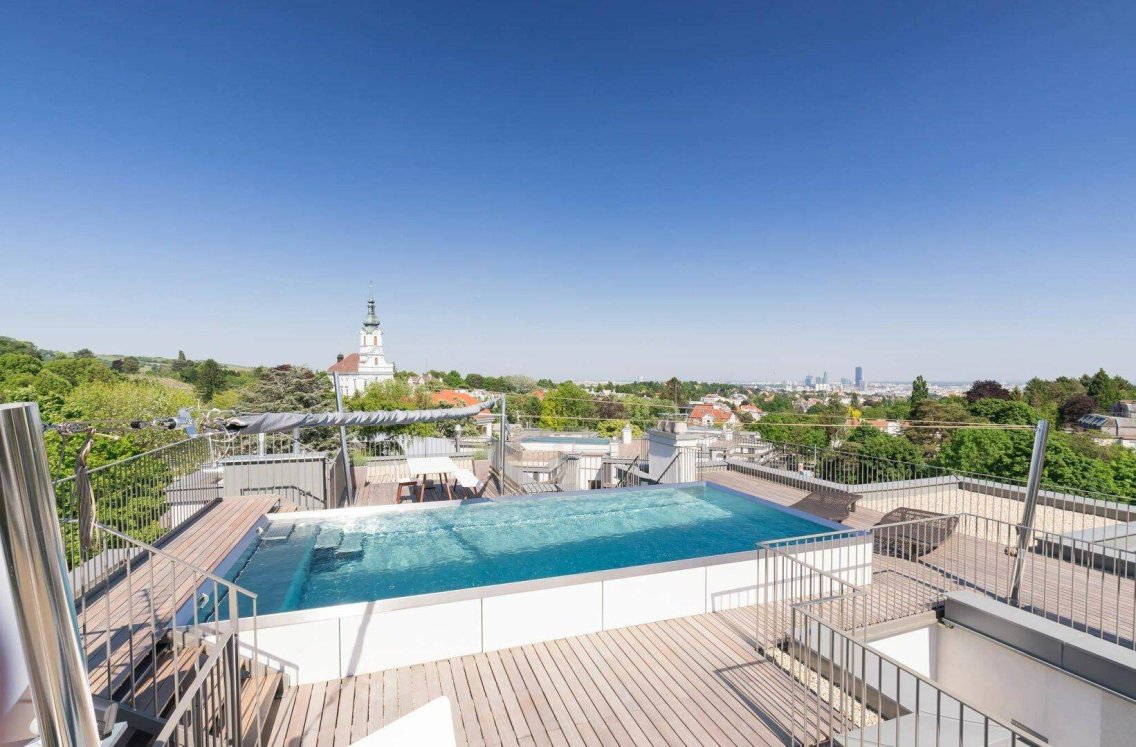 Architektur & AusstattungIn den Kaasgraben Residenzen (aus dem Architektenwettbewerb) werden die Vorteile des modernen Stadtlebens mit den Vorzügen eines eigenen Hauses vereint. Die exklusive Villenbauweise gewährt unter Einsatz modernster Technik höchsten Komfort. In einer terrassenartig angelegten Parkanlage wurden vier lichtdurchflutete Neubauten mit Ost-Süd-West-Lage in perfekter Himmelsausrichtung platziert.Der Niedrigenergiehausstandard und die Nutzung der Erdwärme entsprechen den heutigen Anforderungen nachhaltiger Bauweise, ohne dabei den persönlichen Komfort einzuschränken.Penthouse mit Panorama-Terrasse und eigenem PoolEin traumhafter Ausblick, erstklassige Ausstattung und die exklusive Innenarchitektur sorgen für exzellenten Wohnkomfort. Das Ambiente der exklusiven Penthouses mit eigenem Dachpool garantiert Momente voller Lebensfreude und Genuss. Dieses außergewöhnliche Domizil hat den kompletten Wohnbereich inklusive Schlafräumen auf einer Ebene! Erleben Sie die schönsten Wienblick-Momente von Ihrem Wohnzimmer!Die Wohnung ist im letzten Stock mit 2 Eingängen ohne Nachbarn, hat 3 separate Zimmer, 2 Bäder , 2 Wcs, sowie einen großzügigen Wohnsalon mit offener Küche, es gibt noch eine Küche im kleinerem Zimmer, die Terrassen umranden den ganzen Wohnbereich inklusive Schlafzimmer. Es gibt auch einen Wirtschaftsraum mit Platz für eine Waschmaschine und einen Trockner und Reinigungsutensilien. Die eingebauten Stauräume ziehen sich vom Vorzimmer bis in den Wohnraum. Das Masterbedroom verfügt ebenfalls über eingebaute Schränke, das angeschlossene große Badezimmer mit Doppelwaschbecken, Walk-In Dusche, Badewanne und Ausgang auf die Terrasse.Die Wohnung hat 2 separate Eingänge, wodurch sie in einen Office und Wohnbereiche eingeteilt werden können.Ausstattung: Außenjalousien, Decken- und Fußbodenkühlung im Sommer, Fußbodenheizung, ökologische Heizung mit Erdwärme, Fliesen, Parkett, Naturstein, raumhohe Innentüren, Brandschutztüren, Swimming Pool beheizbar auf der Dachterrasse von Mai bis Oktober (je nach Wetter).Die Wohnung ist derzeit teils möbliert mit Küche2 Garagenplätze sind dabeiWir weisen darauf hin, dass zwischen dem Vermittler und dem zu vermittelnden Dritten ein familiäres oder wirtschaftliches Naheverhältnis besteht.Der Immobilienmakler erklärt, dass er – entgegen dem in der Immobilienwirtschaft üblichen Geschäftsgebrauch des Doppelmaklers – einseitig nur für den Vermieter tätig ist.