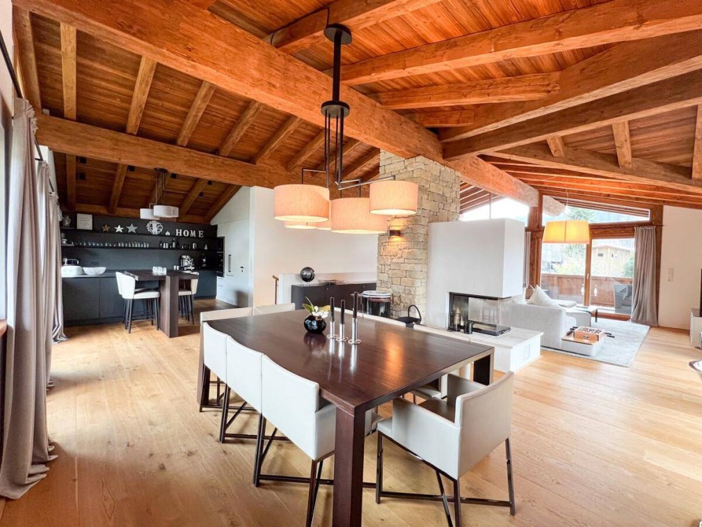 Beim Betreten dieses äußerst geschmackvoll ausgestatteten Chalets fühlt man sich sofort zuhause angekommen. Es bietet sich ein exklusiver Wohnkomfort gepaart mit einer hochwertigen Ausstattung. Im Dachgeschoß wird der neue Mieter von einem lichtdurchfluteten Wohn/Essbereich mit einem offenen Sichtdachstuhl, einem gemütlichen Kamin und einer hochwertigen Profiküche mit „Back Kitchen“, welche die Herzen der Hobbyköche höherschlagen lässt, empfangen. Ein Bürobereich schafft die Möglichkeit von Zuhause aus zu arbeiten. Von den großen Sonnenbalkonen aus genießt man einen traumhaften Blick auf den Wilden Kaiser und die umliegende Kitzbüheler Bergwelt. Sie laden zum Entspannen bei einem schönen Glas Wein und zu gemütlichen Grillabenden mit Freunden ein. Im Erdgeschoß des Hauses befinden sich das Masterschlafzimmer mit Ankleidebereich und direkt daran angrenzend das edle Bad mit Badewanne und Dusche. Vom Masterschlafzimmer gelangen Sie direkt in den zauberhaften Garten. Zwei weitere Schlafzimmer mit modernen Duschbädern schließen sich an. Im Untergeschoß des Hauses gibt es einen Wellnessbereich mit Sauna und Duschbad, hier bietet sich auch die Möglichkeit für ein weiteres Schlafzimmer. Ein Hauswirtschafts-/ und ein Technikraum, sowie ein Schrankraum schließen sich an.