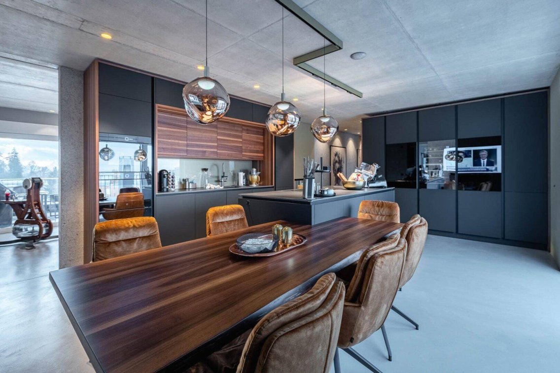 Schweizer V-Zug Küche – erstklassige Qualität und ausgestattet mit Teppanyaki-Grill, Dampfbackofen, Wärmeschublade, Induktionskochfeld, Geschirrspüler, Weinkühler und großzügigem Stauraum erfüllt sie höchste Ansprüche. Sprudelwasser kommt bequem aus dem Wasserhahn. Beim Kochen genießen Sie direkten Blick auf die Festung Kufstein.
