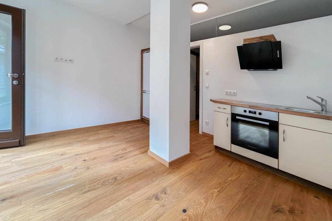 Die Wohnung verfügt über eine klare und effiziente Raumaufteilung mit einem Schlafzimmer, einem Wohnbereich und einem Bad mit bodentiefer Dusche. Zur Ausstattung gehören Fußbodenheizung, eine moderne Gas-Holz-Heizung, eine Einbauküche sowie ein Kleiderschrank. Die Wohnung ist teilmöbliert und sofort bezugsfertig.