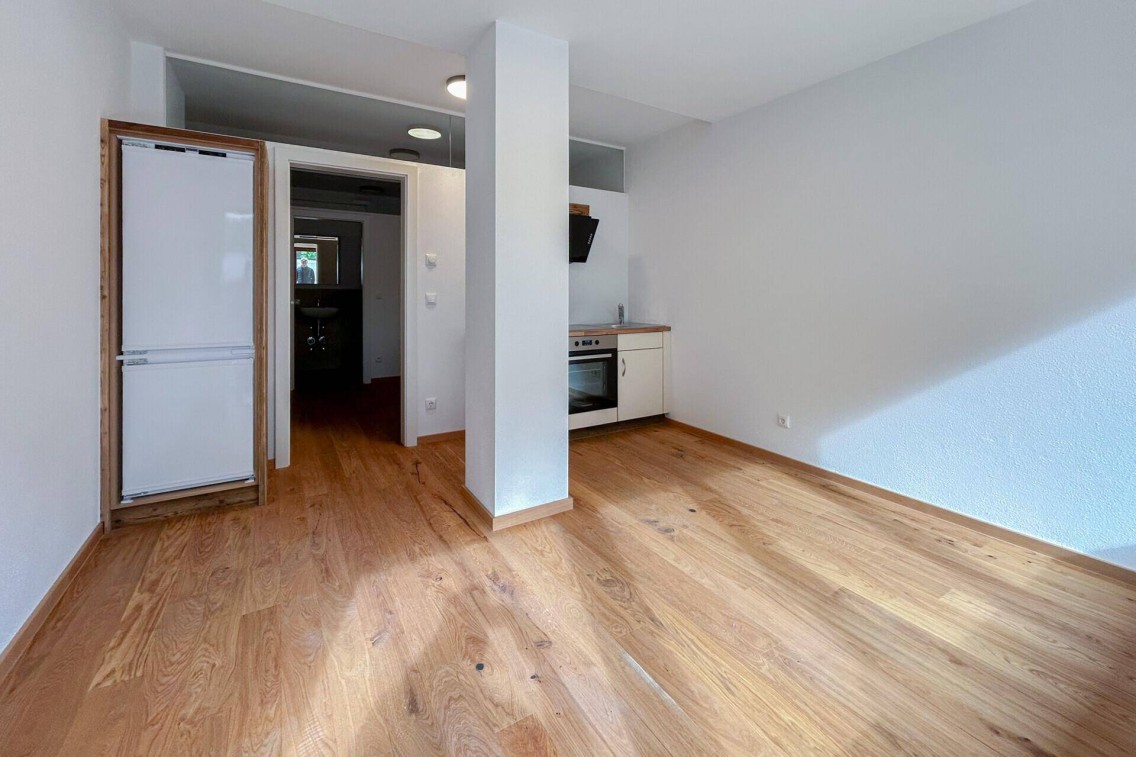 Die Wohnung verfügt über eine klare und effiziente Raumaufteilung mit einem Schlafzimmer, einem Wohnbereich und einem Bad mit bodentiefer Dusche. Zur Ausstattung gehören Fußbodenheizung, eine moderne Gas-Holz-Heizung, eine Einbauküche sowie ein Kleiderschrank. Die Wohnung ist teilmöbliert und sofort bezugsfertig.