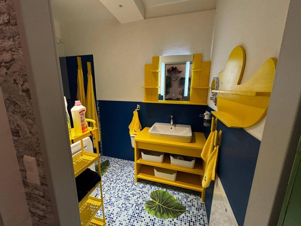 • Waschmaschine im Badezimmer, Wäschetrockner, 2 Design Handtuchhalter, 2 Handtuch-Sets, Föhn, Spiegel mit Design-Regalen, Kosmetikspiegel (20fach-Vergrößerung), Seifenspender