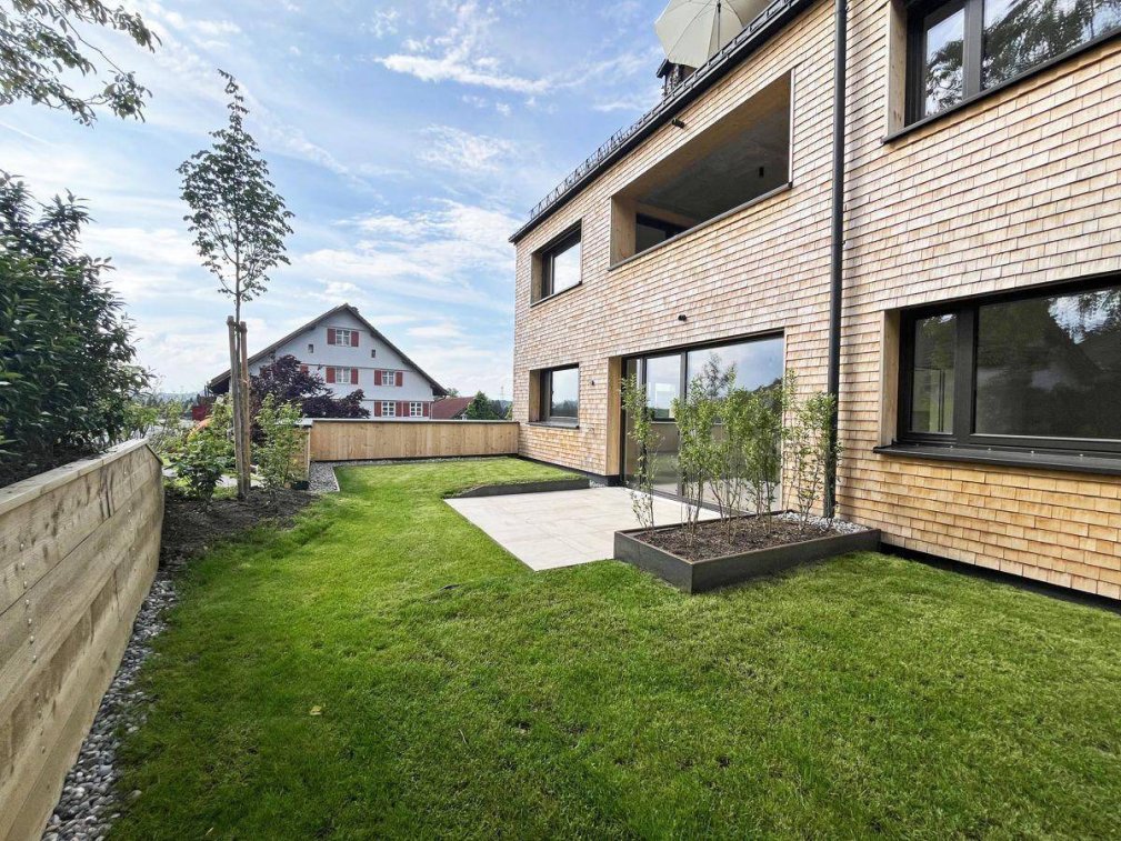 Nahe der deutschen Grenze, in Hohenweiler, befindet sich diese neue Kleinwohnanlage mit lediglich acht Einheiten. Das Gebäude mit seiner charakteristischen Holzschindelfassade ist nach Südwesten ausgerichtet und von schönen Grünflächen, Sträuchern und Büschen umgeben.