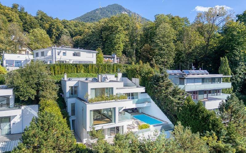 Am Fuße des Gaisbergs erwartet Sie diese moderne Designvilla, die mit unwiederbringlichen Ausblicken auf die Stadt Salzburg und die imposante Bergwelt begeistert. Absolutes Highlight ist der Festungsblick, der Sie beinahe von allen Räumen verzaubert.