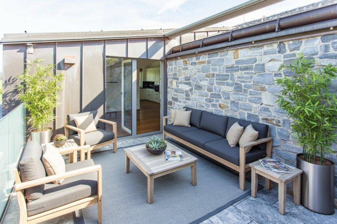 Über eine Treppe, auf der sich im Zwischengeschoß die Einbauschränke für die Garderobe befinden, gelangt man in das Dachgeschoß. Hier sind der Wohnraum samt vollausgestatteter Küche sowie ein Gäste-WC untergebracht. Vom Wohnraum kann auch die Dachterrasse erreicht werden.