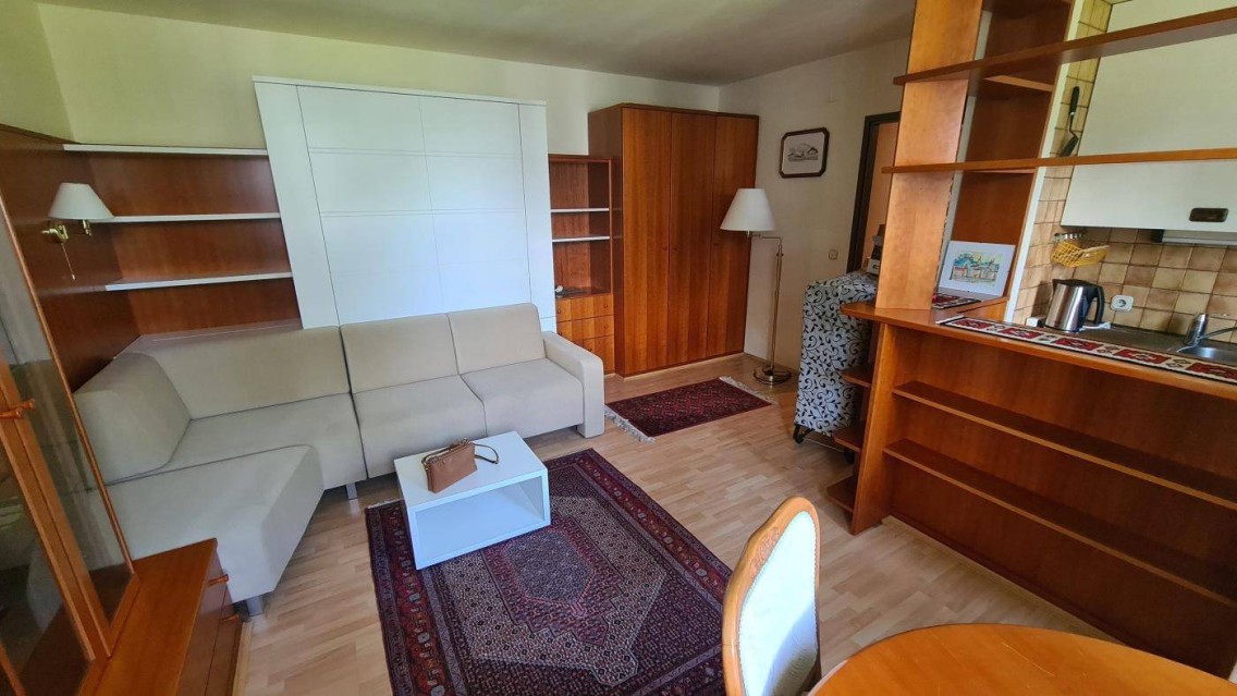 Möblierung: Die Wohnung ist komplett und sehr hochwertig mit Tischlereinbauten möbliert, platzsparendes Schrankbett mit intergrierter Couch.