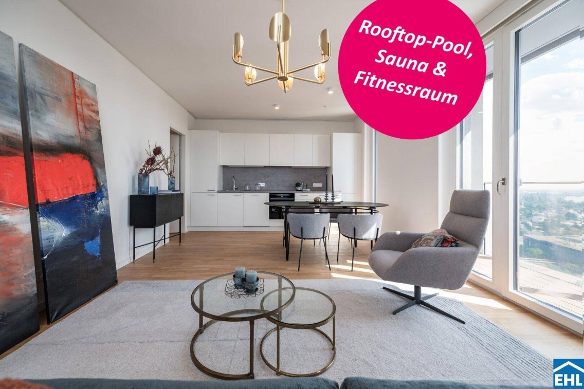 TOWER HOMES im Vienna Twentytwo - Erstbezugswohnungen bei der U1 - Rooftop-Pool, Fitnessraum & Saunabereich!In einzigartiger Lage, direkt bei der U1-Station Kagran und vis-à-vis vom Donau Zentrum, entsteht ein exklusiver, ca. 155m hoher Wohnturm mit 45 Etagen. Die insgesamt 347 Mietwohnungen bieten einen vielfältigen Wohnungsmix: von smart geschnittenen 1,5-Zimmer-Apartments ab ca. 38 m² über komfortable 2-Zimmer-Wohnungen bis hin zu großzügigen 3- und 4-Zimmerwohnungen mit bis zu ca. 80 m².Die Kombination aus moderner Architektur, weiten Glasfronten, hochwertiger Ausstattung und einem nachhaltigen, energieeffizienten Gebäudekonzept schafft ein urbanes Zuhause mit besonderem Wohnkomfort – ideal für Singles, Paare und Familien.Highlights von V2245 Etagen, ca. 155 m Höhe1,5- bis 4-Zimmer-Wohnungen mit optimalen GrundrissenErstklassige Allgemeinflächen:Rooftop-Pool mit großzügiger Terrassenlandschaft, Sitz- & LiegebereichenFitnessraum, Saunabereiche, WaschkücheJugendspielraum mit vorgelagertem KleinkinderspielplatzGemeinschaftsräume mit TerrasseFahrradraum inkl. Waschplatz & WerkbankHundewaschplatzEinlagerungsräume auf allen WohnetagenStellplätze können in der hauseigenen Tiefgarage um € 168,00 brutto angemietet werden.AusstattungDie Ausstattung überzeugt durch ein sorgfältig abgestimmtes, hochwertiges Konzept:Österreichisches Qualitätsparkett von WeitzerItalienisches Feinsteinzeug von MarazziMarken-Sanitärausstattung von Hansa, Villeroy & Boch, GeberitSicherheitstüren (WK3)Holz-Alu-Fenster mit innenliegendem SonnenschutzSmarte Gebäudetechnik - Heizen & Kühlen mittels Bauteilaktivierung/WärmepumpenGlasfaseranschluss (A1, Magenta)Video-GegensprechanlageLage & InfrastrukturDie Lage im 22. Bezirk erfüllt höchste Ansprüche an modernes, urbanes Wohnen:Direkt an der U1-Station Kagran – 11 Minuten bis zum StephansplatzGegenüber vom Donau Zentrum mit vielfältigen Shopping- & GastronomieangebotenWenige Minuten zur Alten Donau, Donauinsel und Donaupark – für Sport & FreizeitNähe zu internationalen Unternehmen, Bildungsinstitutionen und der UNO-CityBitte beachten Sie, dass es sich bei den Fotos lediglich um Musterfotos handelt!