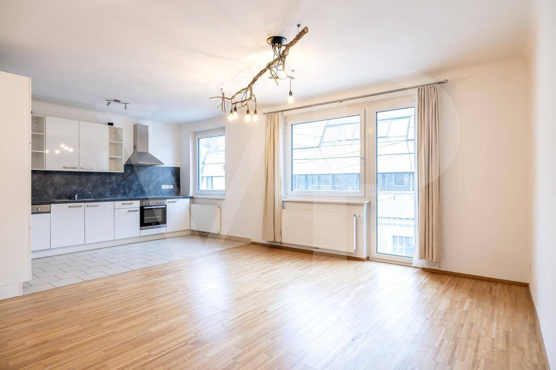 Das Herzstück der Wohnung ist die große Wohnküche mit ca. 33 m². Hier befindet sich auch der kleine Balkon.