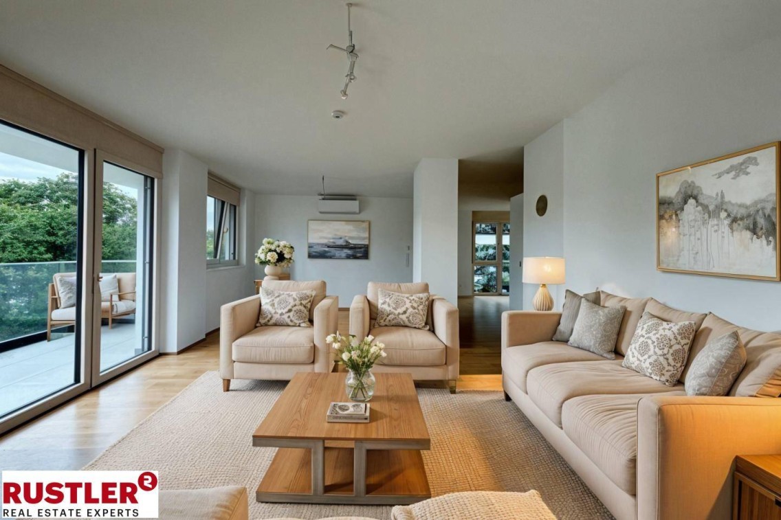 Vom Vorraum begehbar erreichen Sie zwei Schlafzimmer, eines davon mit eigenem Masterbad, einen praktischen Abstellraum sowie eine offen gestaltete, sehr großzügige und lichtdurchflutete Wohnküche, die direkt auf den nord-westseitigen Balkon führt. Vom Balkon aus können Sie einen herrlichen Blick ins Grüne genießen.