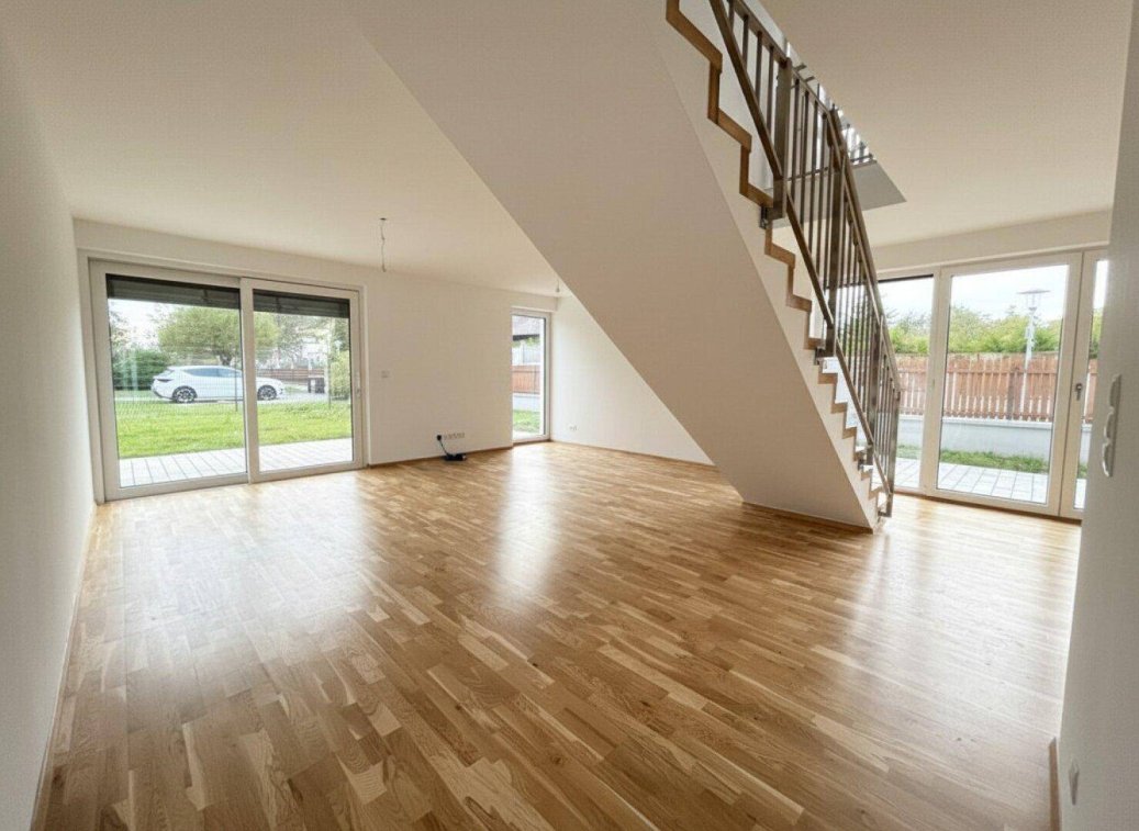 Im Erdgeschoss der Häuser finden Sie den Wohnraum mit Küche, ein WC, einen Vorraum und einen Hauswirtschaftsraum samt Technikeinheit für die Luftwärmepumpe, die für die Wärmebereitstellung dient. Im Obergeschoss befinden sich die Schlafzimmer und das Badezimmer. Den Bewohnern der größeren Doppelhaushälfte steht zusätzlich eine private Terrasse im Obergeschoss zur Verfügung. Eines der nach Südosten ausgerichteten Schlafzimmer hat außerdem einen eigenen Balkon. AusstattungDie Häuser sind mit langlebigen Kunststoff-Alu-Fenstern und einer massiven Alu-Haustüre ausgestattet. Eine moderne, effiziente Luftwärmepumpe sorgt dabei für wohlige Wärme durch eine Fußbodenheizung. Zur Abschattung wurden außerdem elektrische Rollläden installiert.KaufoptionDas Haus kann man sofort kaufen. Der aktuelle Kaufpreis beträgt 495.000 €, oder es kann während der Mietzeit jederzeit zum aktuellen Marktpreis erworben werden.LageWöllersdorf-Steinabrückl, am Auslauf des Piestingtals, ist eine Marktgemeinde im Bezirk Wiener Neustadt-Land in Niederösterreich mit ca 4.210 Einwohner. Steinabrückl liegt im Industrieviertel in Niederösterreich. Die Fläche der Marktgemeinde umfasst 14,46 Quadratkilometer, ca. 43,2 Prozent der Fläche sind bewaldet. Die Gemeindegebiet besteht aus den Katastralgemeinden Steinabrückl und Wöllersdorf.Die Liegenschaft befindet sich in der Leopold Lehnerstraße in einer guten Wohngegend. Nach Wiener Neustadt fährt man mit dem Auto weniger als 5 Minuten, ebenso wie zur Autobahn. Nach Wien sind es ca. 30 Minuten.In näherer Umgebung befinden sich nicht nur wunderbare Rad- und Wanderwege, sondern auch ein Kräuter- und Bienenlehrpfad und das über die Grenzen hinaus bekannte Waldbad in der Nachbarortschaft Markt Piesting. Für Sportliche gibt es Tennisplätze oder einen Beachvolleyballplatz und Kulturinteressierte kommen im Festsaal der Gemeinde auf Ihre Kosten. Ob Bälle, Theateraufführungen, Kabarettvorstellungen oder Konzerte - hier ist sicher für jeden etwas dabei.Volksschule und Kindergarten befinden sich im Ort. Im nahen Wiener Neustadt, welches Ihre Kinder bequem mit Bahn oder Bus erreichen, gibt es darüber hinaus sämtliche Bildungseinrichtungen und Schulen bis hin zur Fachhochschule.Ebenso erreichen Sie alle Einkaufsmöglichkeiten (Lebensmittel, Apotheke, Drogerie, etc.) in weniger als 5 Minuten. Direkt bei der Autobahnauffahrt/-abfahrt befinden sich zudem eine Billa- und Pennyfiliale und in 10-15 Minuten erreichen Sie Hornbach, Bauhaus, den Fischapark Wiener Neustadt und vieles mehr.In kurzer Gehweite gibt es eine Haltestelle für Lokalbusse. Der Bahnhof Felixdorf ist mit dem Bus in nur wenigen Minuten zu erreichen. Der Bahnhof Wiener Neustadt ist ebenso zügig mit dem Bus erreichbar. Wir weisen darauf hin, dass zwischen dem Vermittler und dem zu vermittelnden Dritten ein familiäres oder wirtschaftliches Naheverhältnis besteht.Der Immobilienmakler erklärt, dass er – entgegen dem in der Immobilienwirtschaft üblichen Geschäftsgebrauch des Doppelmaklers – einseitig nur für den Vermieter tätig ist.