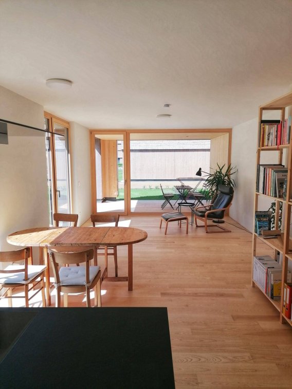Im Inneren der Wohnung erwartet Sie ein modernes und helles Ambiente. Die offene Gestaltung schafft ein großzügiges Wohngefühl, während die hochwertigen Materialien (Eschenparkett im Wohn- und Schlafbereich, Fliesen im Eingangs-, Koch- und Badbereich, Lärchenfenster, Fichtentäfer und Lärchenbohlen in der Loggia) und die moderne Ausstattung für ein angenehmes Wohngefühl sorgen. Der Gartenbereich bietet zusätzlichen Platz im Freien, ideal zum Entspannen oder für gesellige Abende mit Freunden und Familie.