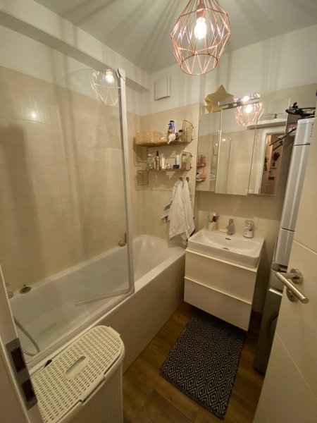 Badezimmer mit Badewanne und Waschbecken, Wasch und Trocker anschluß