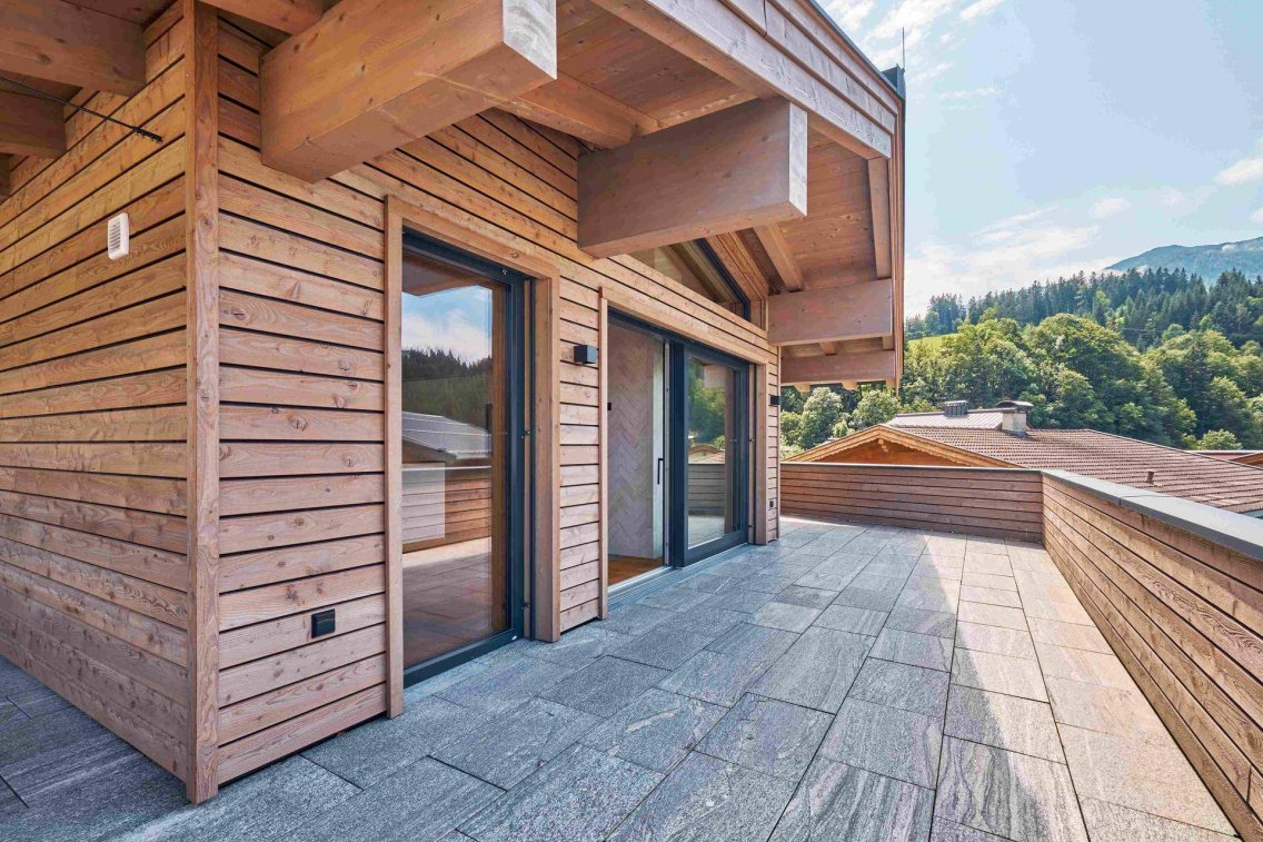 Diese Terrasse bietet einen unvergesslichen Blick auf die majestätische Bergwelt von Fieberbrunn und lädt vor allem während sommerlicher Temperaturen zum Sonnen und Entspannen ein.