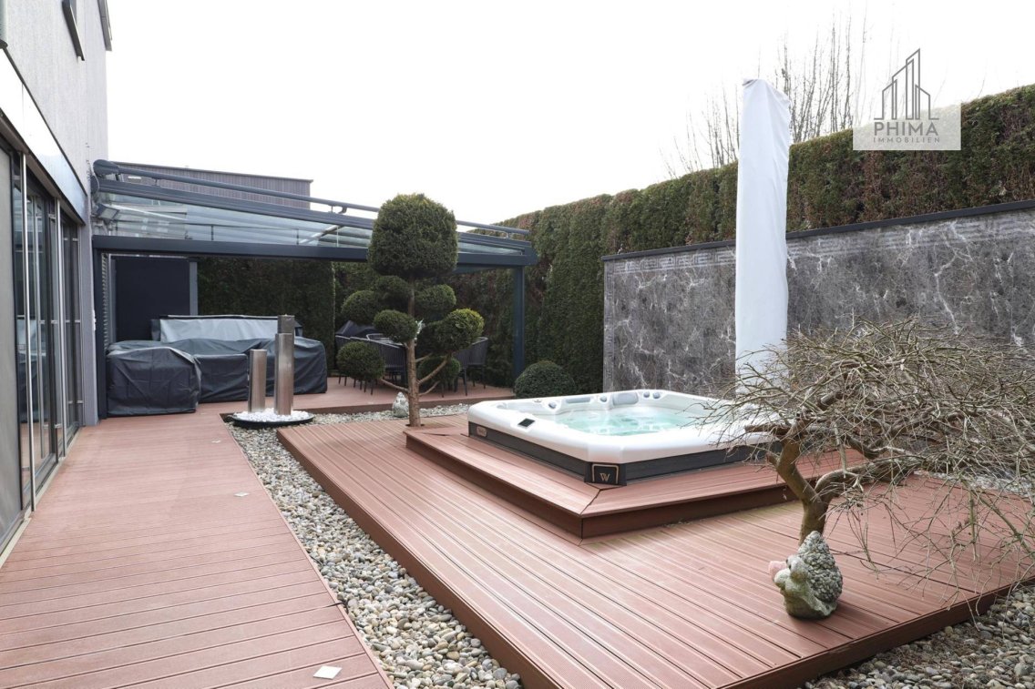 In der Einödstraße 4 befindet sich das 2002 erbaute und ständig renovierte Reihenhaus. Gleich zu Beginn besticht die Immobilie durch den perfekten Erhaltungszustand und die durchdachte Raumaufteilung. Der helle, lichtdurchflutete Wohn- und Essbereich mit hochwertiger Ausstattung im Erdgeschoss ermöglicht den direkten Zugang zum Gartenbereich. Dieser umfasst neben einem neuwertigen Whirlpool auch eine überdachte Lounge, die zum Entspannen einlädt.