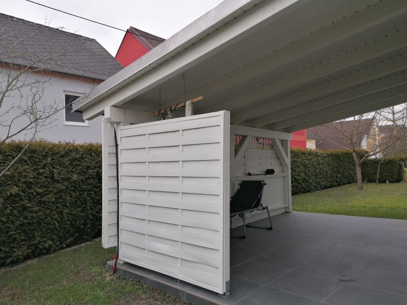 Das Haus verfügt über eine geräumige Garage (für 2 Autos) sowie einen überdachten Stellplatz für zB Fahrräder oder Motorrad.