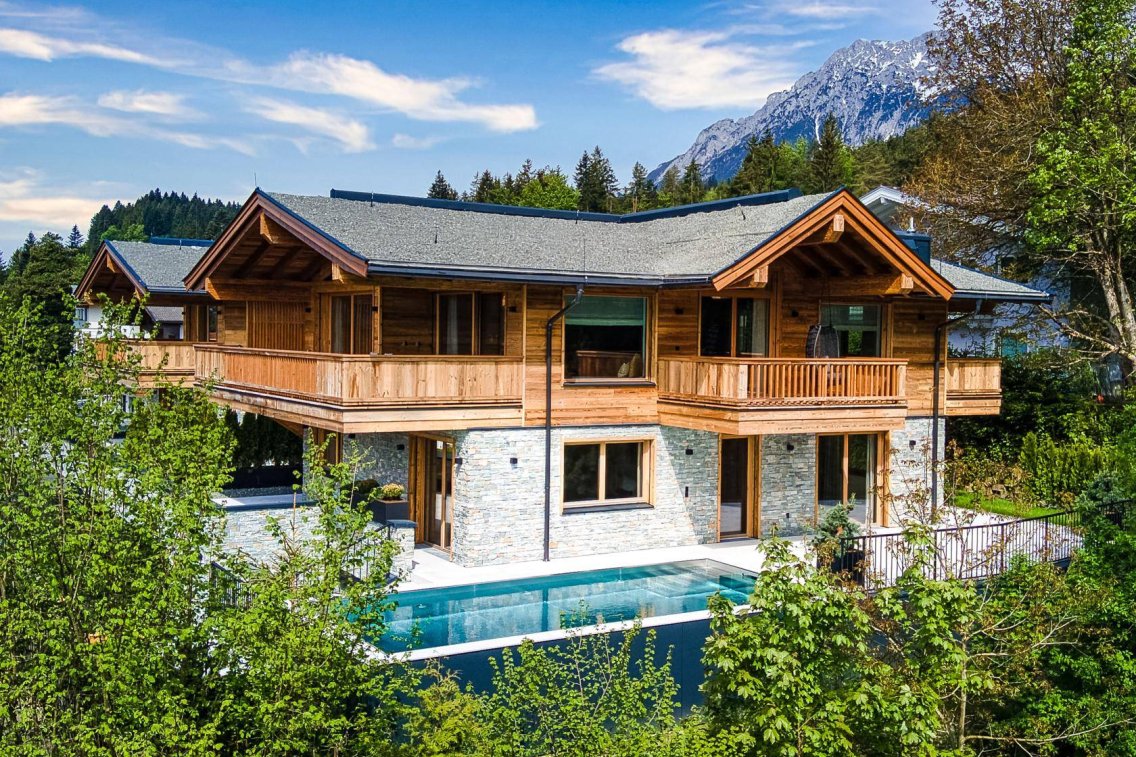 In der idyllischen, ruhigen und besonders sonnigen Toplage Föhrenwald entstand hier das Doppel-Chalet “KAISERJUWEL”, welche schon mit der Außenoptik in luxuriös alpinem Stil überzeugen. Mit der wohldurchdachten Planung werden im Obergeschoss offen gestaltete, überaus gefällige Wohn- & Essbereiche mit Kaminöfen und wunderbaren Raumhöhen mit Altholz-Sichtdachstühlen geschaffen, die in Verbindung mit den bodentiefen Fensterfronten ein sensationell lichtdurchflutetes Wohlfühl-Ambiente erleben lassen. Der Ausblick, den man von dieser Ebene aus genießen darf, ist faszinierend und die großflächigen Balkone mit Freisitzen erweitern diesen Panoramablick. Das erste Obergeschoss beinhaltet die Schlafebene auf welcher zwei Schlafzimmer, jeweils mit einem Bad en suite und einem großzügigen Masterbereich mit exklusivem Badezimmer untergebracht sind. Das Erdgeschoss empfängt Sie in einem einladenden Foyer mit Garderobe; zudem finden auf dieser Ebene ein weiteres Schlafzimmer mit eigenem Badezimmer und ein außergewöhnlich ansprechender Spa-Bereich mit Sauna, Ruhezone und einem Lichthof Platz. Die Eingangsbereiche sind mit der Garage (je zwei Stellplätze) verbunden und jedem Chalet steht ein Sportgeräteraum zur Verfügung. Zudem finden sich auf dieser Etage ein Abstell- & Wirtschaftsraum sowie ein Raum für die Haustechnik.