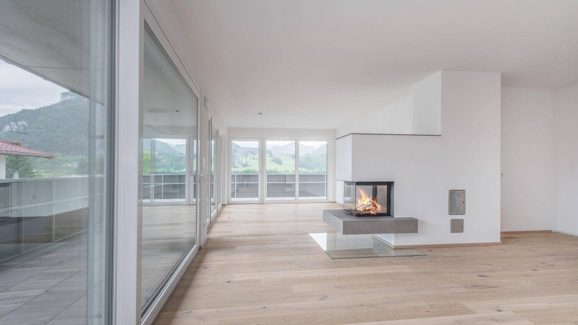 Highlight des Apartments ist der ca. 50 m² große Wohn-Essbereich, dieser besticht vor allem durch die übergroßen Glasfronten und den damit verbunden Panoramablick auf das Kitzbüheler Horn bis hin zum Wilden Kaiser. Auch für eine große Küche ist ausreichend Platz und der mittig angeordnete Kamin dient ideal als Raumteiler.