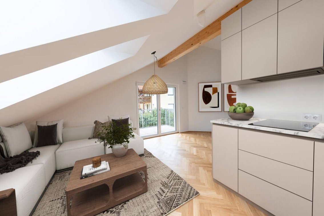 Hinweis: Einige der abgebildeten Fotos zeigen Visualisierungen (Küche & Einrichtung) und dienen lediglich der Veranschaulichung. Die Wohnung wird ohne Küche und Möblierung verkauft.