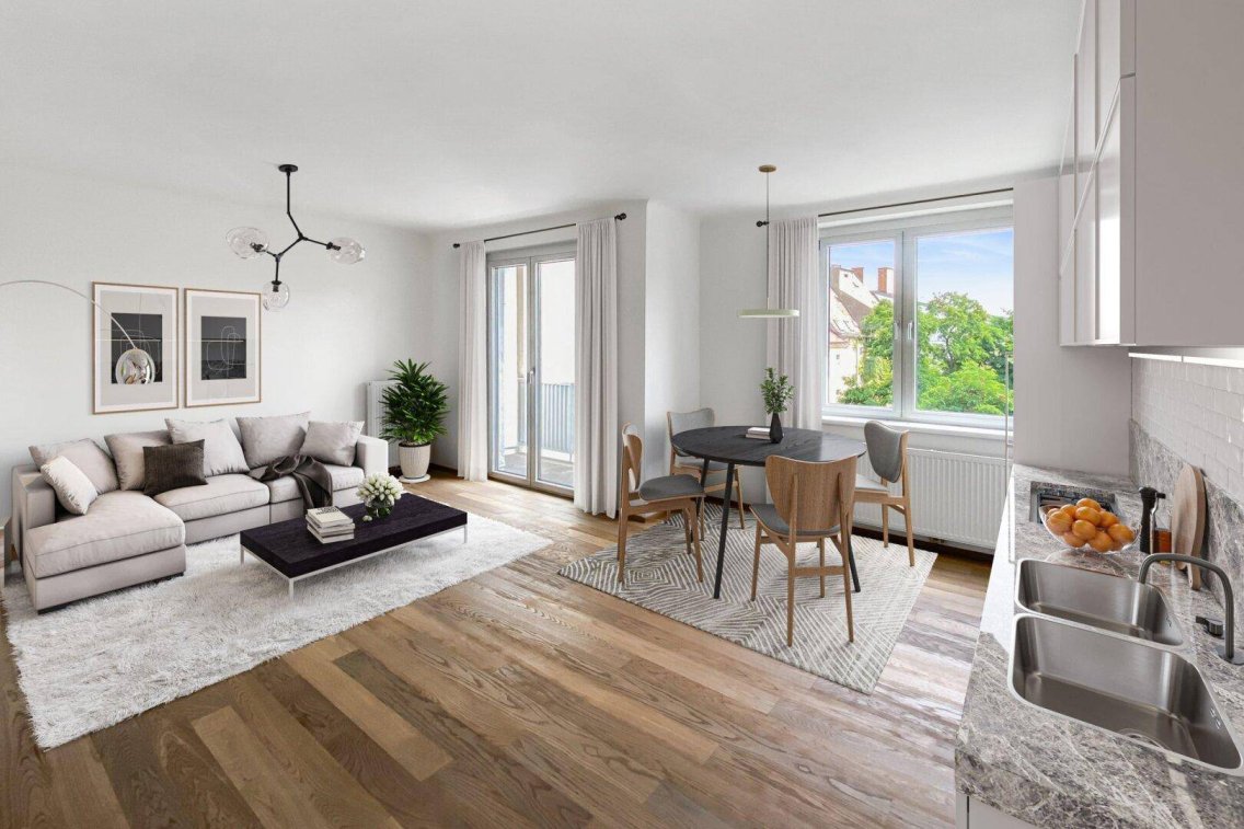 Zum Verkauf steht eine erstklassige Wohnung, die mit einer hochwertigen Generalsanierung begeistert. Diese exquisite Immobilie befindet sich direkt neben einer Fußgängerzone und in unmittelbarer Nähe zur U Bahn-, Bus- und Schnellbahn Station Wien Floridsdorf. Sie besticht durch ihre erstklassige Ausstattung und verfügt über einen eleganten Parkettboden sowie edle Steinfliesen im Badezimmer.Das großzügige Wohnzimmer bietet viel Platz für gemütliches Beisammensein und lädt zum Verweilen ein. Zwei Schlafzimmer bieten ausreichend Raum für erholsamen Schlaf. Das Badezimmer mit Tageslicht sorgt für eine angenehme Atmosphäre und ein separates WC erhöht den Komfort.Aufteilung:• 26m2 großes Wohnzimmer mit Küchenanschlüsse• 2 Schlafzimmer• 1 Badezimmer• 1 separates WC• 1 KellerabteilEin absolutes Highlight ist die wunderschöne Loggia, die sich in einen ruhigen, grünen Innenhof öffnet. Hier können Sie die Ruhe genießen und entspannte Stunden verbringen.Die Wohnung befindet sich in einer begehrten Lage im 21. Bezirk von Wien und überzeugt durch beste Anbindung und Infrastruktur. Alle wichtigen Einrichtungen wie Einkaufsmöglichkeiten, Schulen und öffentliche Verkehrsmittel befinden sich in unmittelbarer Nähe.Bei dem Wohn-/Esszimmer Foto handelt es sich um eine Visualisierung.Wir weisen darauf hin, dass zwischen dem Vermittler und dem zu vermittelnden Dritten ein familiäres oder wirtschaftliches Naheverhältnis besteht.Der Vermittler ist als Doppelmakler tätig.