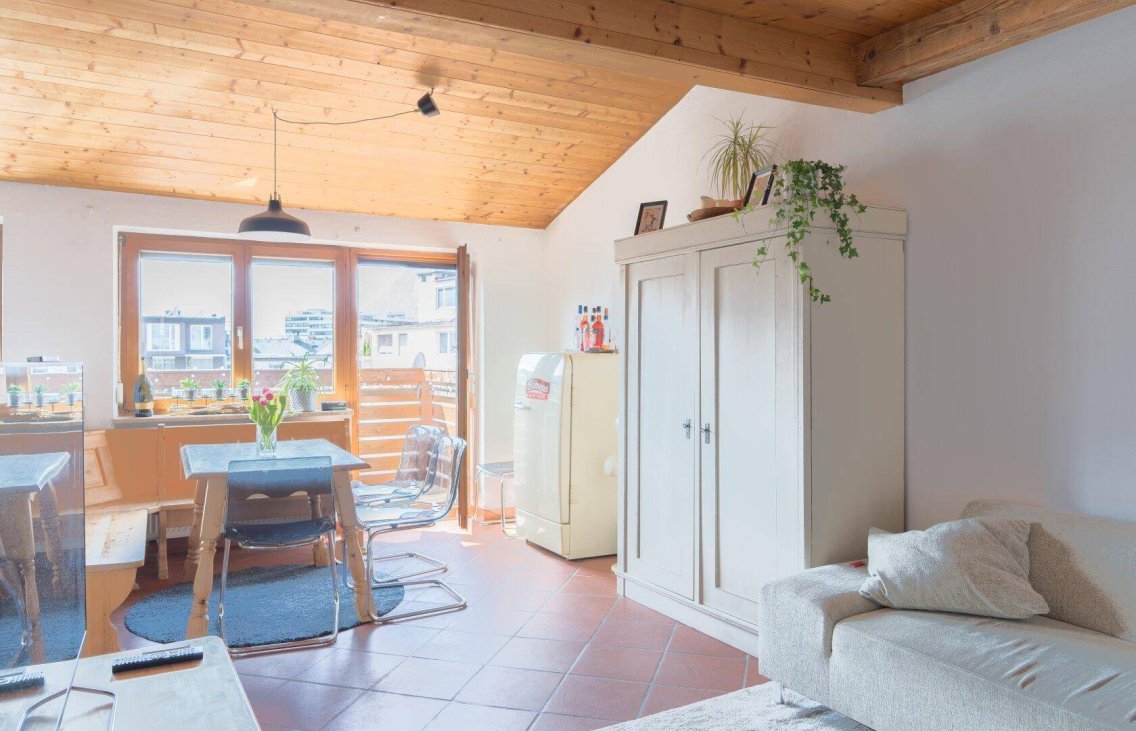 In attraktiver Innenstadtlage von Innsbruck bieten wir exklusiv folgende Dachgeschoss-Wohnung zum Verkauf an.Befindlich im vierten OG eines Ende des 19 Jhd. errichteten Gründerzeithauses.Die Anlage befindet sich in altersbedingt gutem Erhaltungszustand und vermittelt einen gepflegten Eindruck.Das Geschoss wurde in den 80ern ausgebaut. Eine weitere Aufstockung um den Dachboden wäre nach Absprache mit dem Nachbarn prinzipiell möglich.Aufteilung: Garderoben- Gangbereich, separates WC, Bad inkl. Wanne, drei Zimmer, Wohnzimmer mit angrenzendem Koch- Essbereich.Über die Westfassade der Wohnung erstreckt sich der Balkon, von welchem sich ein wunderschöner Panoramablick von der Stadt über die Tiroler Bergewelt eröffnet.Dort befindet sich auch ein kleiner Abstellraum.Die Zimmer verfügen über die für s Dachgeschoss charakteristischen Schrägen. 80er typisch fanden Holzvertäfelungen sowie Terra Kotta Fliesen Verwendung.Bad u. Küche wurden vor ein paar Jahren erneuert.Die Wohnung ist bis Sommer 2028 befristet als Studenten- WG vermietet.Das Zentrum der Landeshauptstadt Innsbruck liegt vor der Haustür.Infrastrukturelle Einrichtungen des täglichen Bedarfes wie Nahversorger, Apotheke, Bank, Post usw. befinden sich in unmittelbarer Nähe.Kindergarten, Schule u. Universitäten sind mit dem Rad bzw. Öffis schnell erreichbar.Sofern wir Ihr Interesse geweckt haben, lassen wir Ihnen gerne ein detailliertes Angebot zukommen.Für detailliertere Eindrücke:https://www.youtube.com/watch?v=BCetmMpJTYghttps://www.corum-immobilien.at/Der Vermittler ist als Doppelmakler tätig.