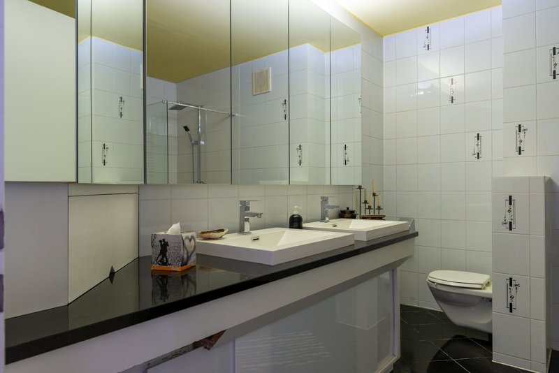Die Wohnung liegt zwischen zwei begrünten Innenhöfen, wodurch die Kombination aus perfekter Infrastruktur und Ruhe gewährt wird. Sämtliche Räume befinden sich auf einer Ebene und sind barrierefrei mit einem Aufzug in den 5. Stock erreichbar. Besonderes Augenmerk wurde auf eine gehobene Ausstattung mit hochwertigen Materialien, wie Naturstein- und Parkettboden, modernem Design und großzügigem Wohnbereich gelegt. Die Terrasse bietet einen weiten Ausblick nach Südwesten.