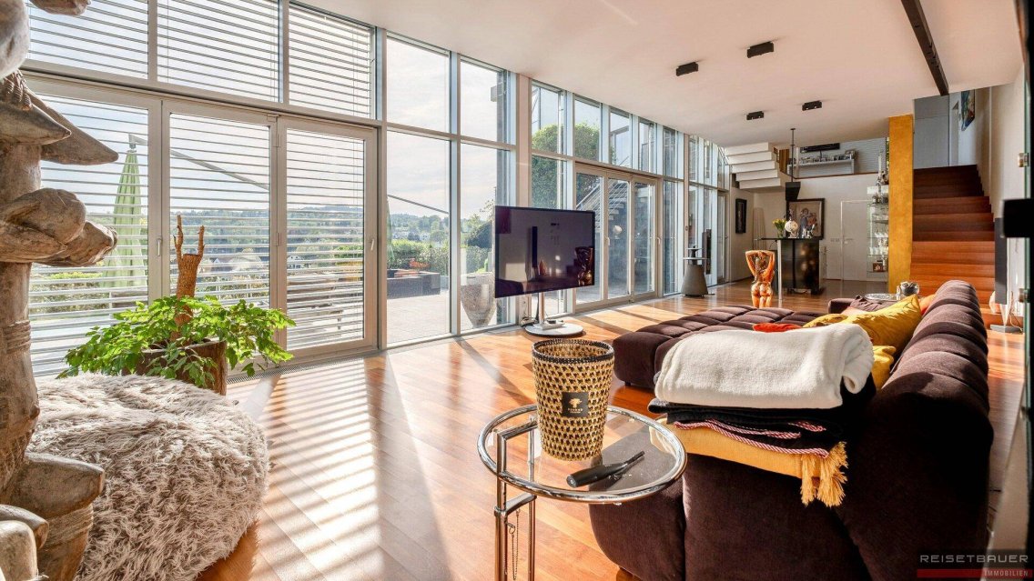 • Alarmanlage und AußenstrahlerDie großflächigen Fenster im gesamten Gebäude ermöglichen einen unvergleichlichen Ausblick und betonen die Exklusivität der Räumlichkeiten.